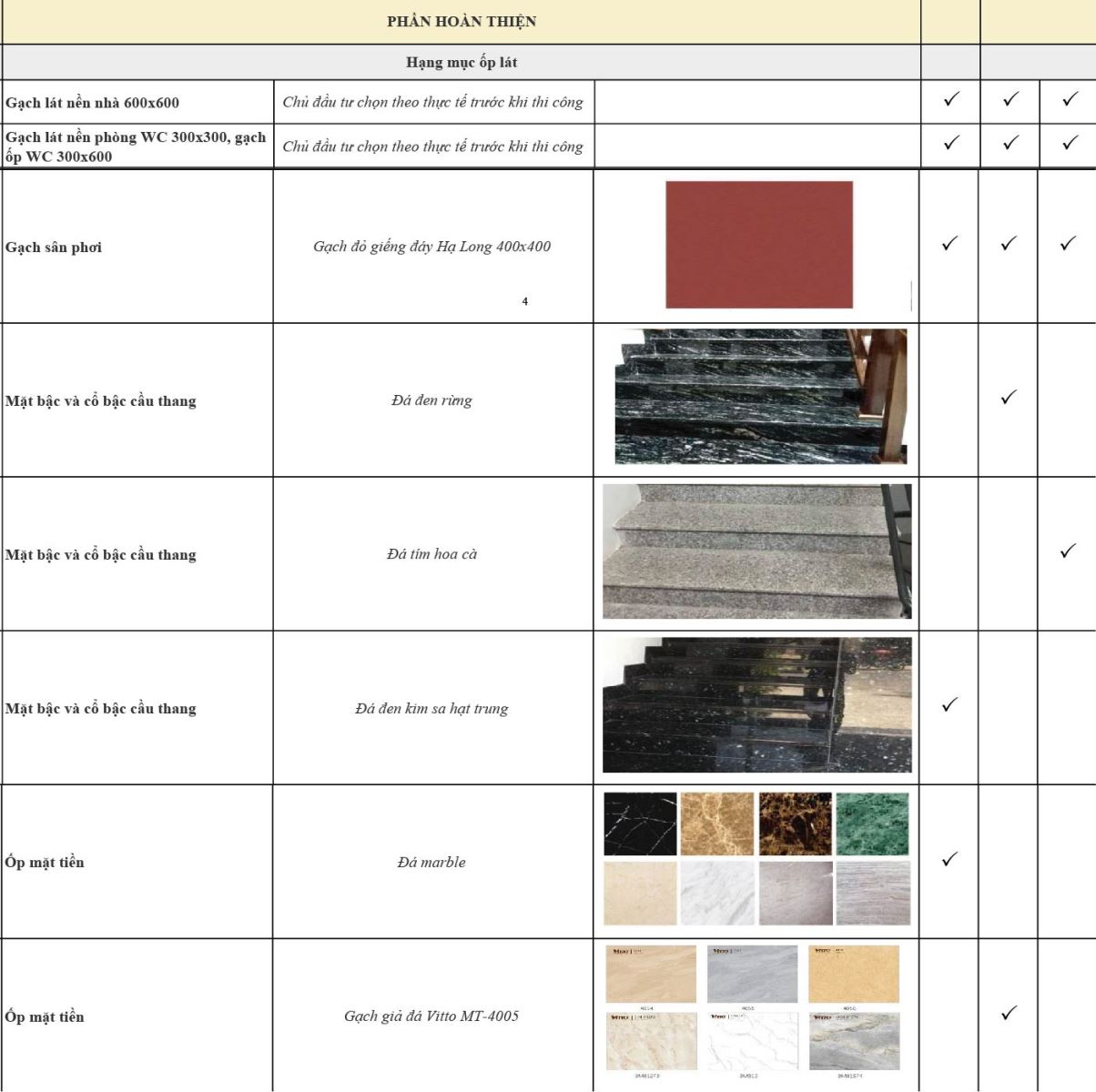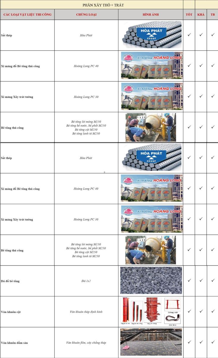 TỔNG HỢP 1 SỐ HẠNG MỤC VẬT TƯ THEO CÁC GÓI TỐT, CƠ BẢN, TIẾT KIỆM