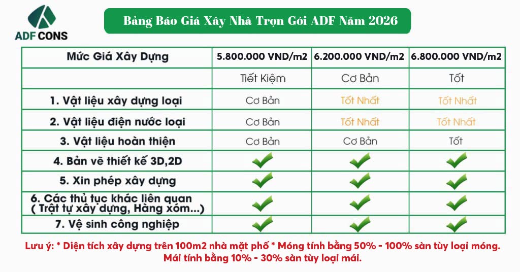 Sau đây là BẢNG BÁO GIÁ XÂY NHÀ TRỌN GÓI 2026 CỦA ADF